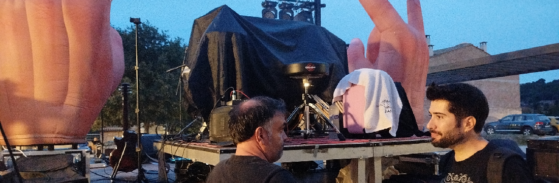 Mientras se desinflaban los castillos hinchables y nos comíamos un trozo de coca con chocolate fuimos montando y probamos en un tiempo record. Jordi nos tiene por la mano, ¡cómo sonaba aquello! El Music Show estaba a punto de comenzar, por lo que fuimos a cenar para tener esa parte cubierta. Ensaladas y butifarra para coger fuerzas con un cafecito de postre que nos ayudó a contemplar las últimas actuaciones del Music Show (en el que el año pasado tocó Rammstein).